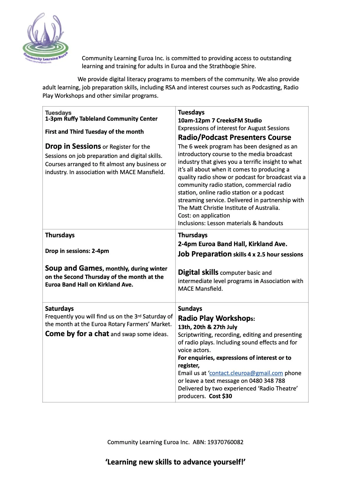 Digital Banking. With the disappearance of bank Branches and now Cheques we must increasingly rely on online (digital) banking. A local representative will deliver a session on digital banking at the Euroa Band Hall in July. Date to be confirmed.
